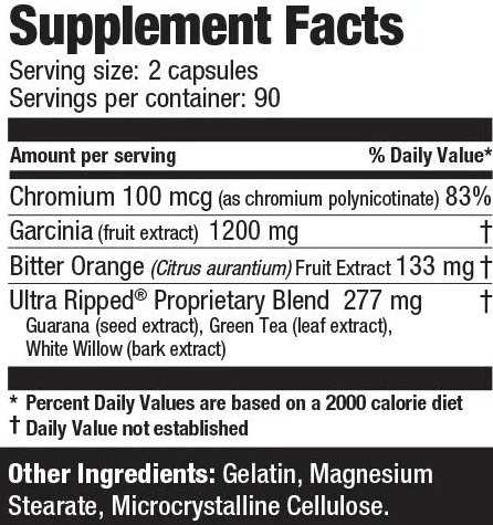 Ultra Ripped Ephedra Free від Ultimate Nutrition - це потужна формула для спалювання жиру, розроблена спеціально для прискорення метаболізму і підтримки оптимального рівня енергії. Цей продукт поєднує в собі три основні інгредієнти: хром, екстракт гарцинії та екстракт плодів гіркого апельсина, які допомагають зменшити накопичення жиру і сприяють його спалюванню. Безпечна альтернатива для тих, хто уникає ефедри, Ultra Ripped допомагає досягати результатів швидше й ефективніше.