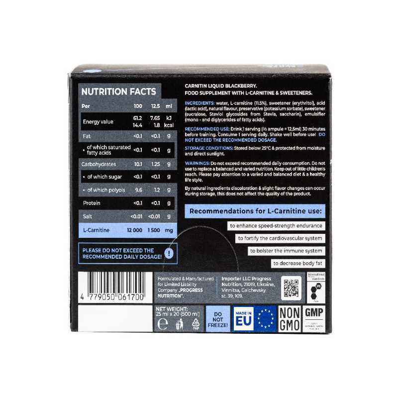 Carnitine Liquid 3000 мг – це високоефективна харчова добавка на основі L-карнітину, призначена для підтримки енергетичних процесів в організмі та підвищення загальної витривалості. L-карнітин є природною речовиною, що синтезується в організмі і бере участь у транспорті жирних кислот до мітохондрій, де вони спалюються для вироблення енергії. Однак інтенсивні фізичні навантаження, стрес та неправильне харчування можуть знижувати його рівень, що негативно позначається на фізичній активності та загальному самопочутті. Progress Nutrition пропонує висококонцентровану рідку форму L-карнітину з дозуванням 3000 мг на порцію, що дозволяє швидко та ефективно забезпечити організм необхідною кількістю цієї важливої речовини.
