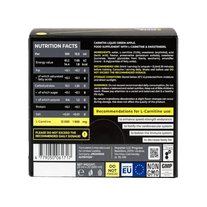 Progress Nutrition Carnitine Liquid 3000 mg – це ідеальний вибір для тих, хто прагне досягти максимальних результатів у тренуваннях, підвищити витривалість та енергійність, а також підтримати здоров'я серцево-судинної системи. Продукт сприяє активному спалюванню жирів, допомагає швидше відновлюватися після фізичних навантажень та знижує рівень втоми.