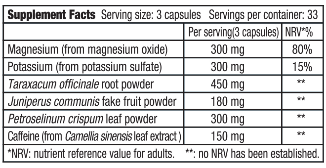 Склад препарату: калію сульфат, магнію оксид, екстракт кульбаби, рослинний кофеїн, екстракт ялівцю, антизлежувач, желатинова оболонка.