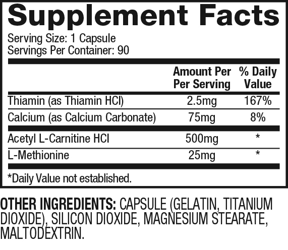 Одна капсула добавки містить 500 мг карнітину, 25 мг тіаміну. 25 мг метіоніну.