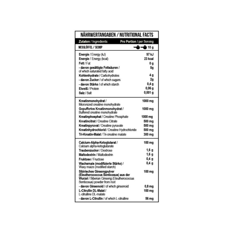 · по 1 г креатину моногідрату мікрокристалізованого, моногідрату буферизованого та фосфату;
