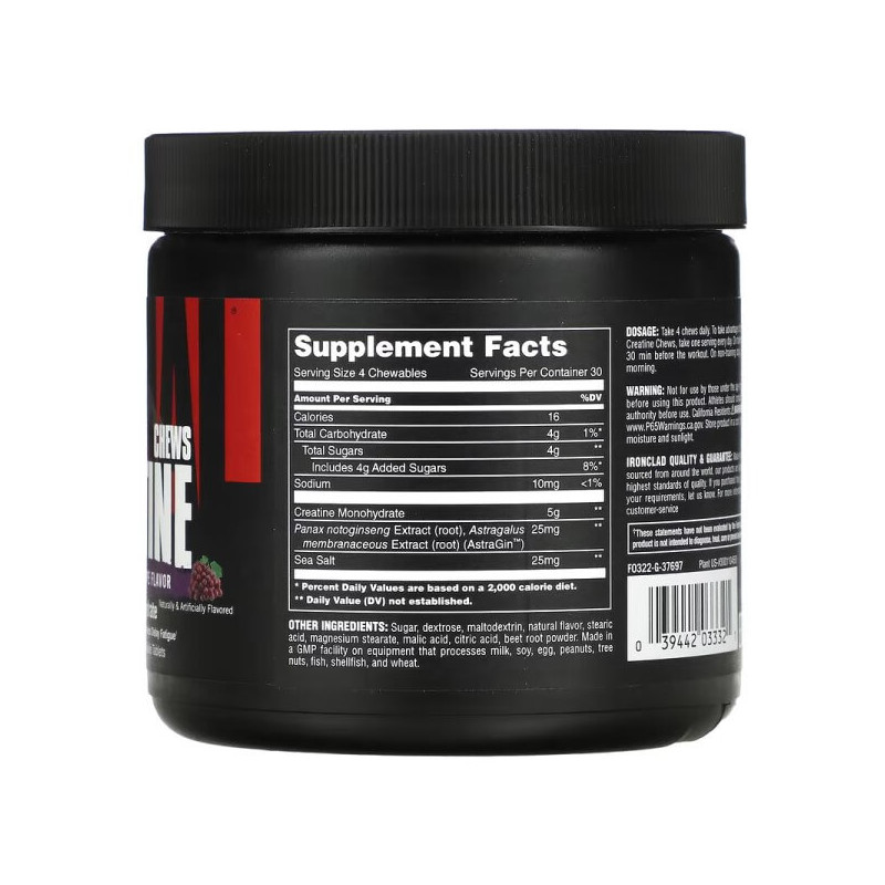 Animal Creatine Chews від популярного американського бренду Universal Nutrition – чистий креатин у добре засвоюваній, адаптованій під потреби людського організму у формі моногідрату. Його органічно доповнюєте екстракти коренів помилкового женьшеню та астрагалу.