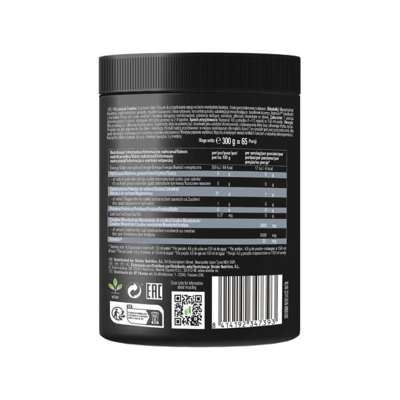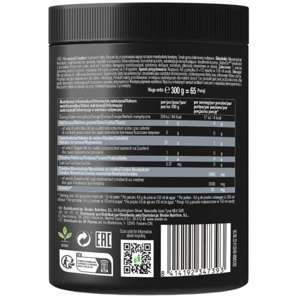 Micronized Creatine від легендарного німецького бренду Weider – креатин нового покоління, що пройшов обробку методом мікронізації. Така технологія дозволяє підвищити біодоступність та покращити засвоюваність нутрієнта. А рослинний інгредієнт – матриця AstraGin з високим вмістом сапонінів, до якої входять екстракти женьшеню та астрагалу – покращує роботу кишечника та всмоктування креатину.
