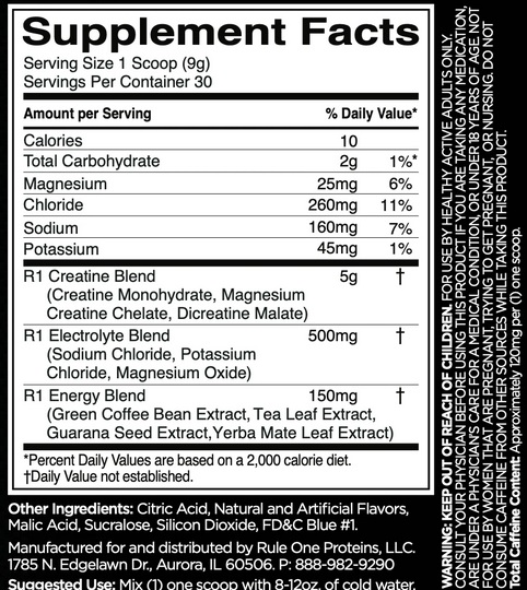 Калорії: 10 ккал Вуглеводи: 2 г Магній: 25 мг Хлор: 260 мг Натрій: 160 мг Калій: 45 мг У склад Rule 1 Charged Creatine входить R1 Creatine Blend 5 г, R1 Electrolyte Blend 500 мг та R1 Energy Blend 150 мг. Крім цього, продукт містить інгредієнти, такі як лимонна кислота, натуральні та штучні ароматизатори, яблучна кислота, сукралоза та діоксид кремнію, що надають йому його унікальність та ефективність.