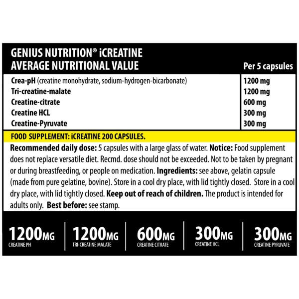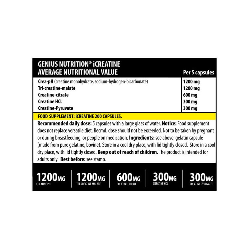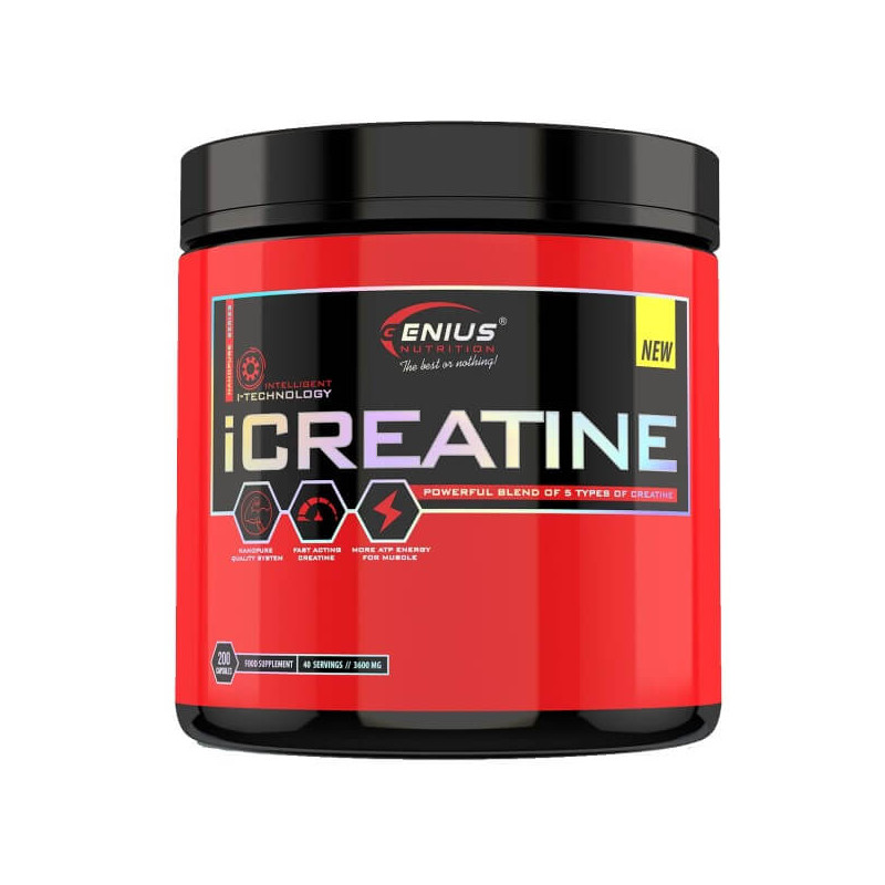 iСreatine від відомого бренду біодобавок Genius Nutrition – інноваційний збалансований креатиновий комплекс, до складу якого входять одразу п'ять видів креатину з різним часом засвоєння та особливостями впливу на організм. Це стійкий до шлункового соку Crea-PH, трикреатин малат, що швидко засвоюється, чудово метаболізується цитрат креатину, добре розчинний гідрохлорид креатину з високою біодоступністю, а також піруват креатину, що відповідає за виробництво енергії.