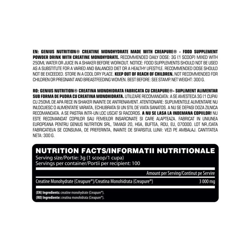 Creatine Creapure від відомого європейського бренду Genius Nutrition – чистий креатину моногідрат, представлений у вигляді унікальної запатентованої формули Creapure. Його одержують із натуральної сировини, що пройшла всі стадії підготовчої обробки, очищення, стандартизації та контролю. Як результат споживач отримує ефективний продукт, що добре поєднується з іншими біодобавками, правильне вживання якого не викликає негативних побічних реакцій та звикання.