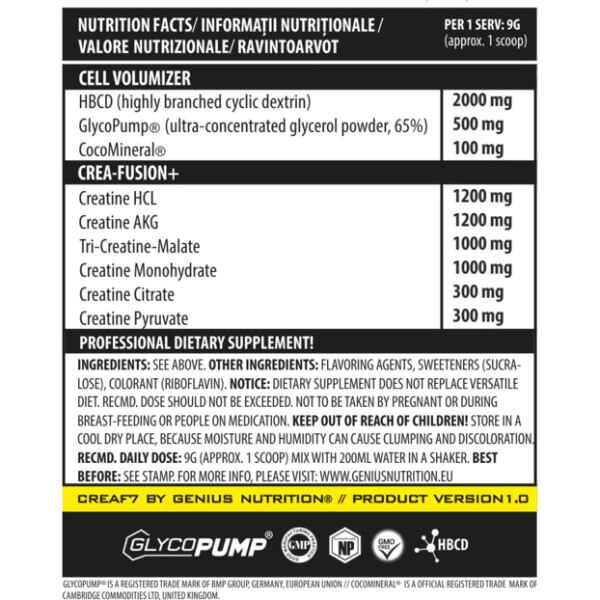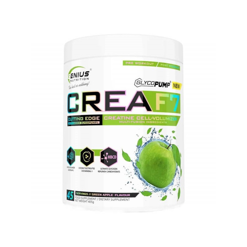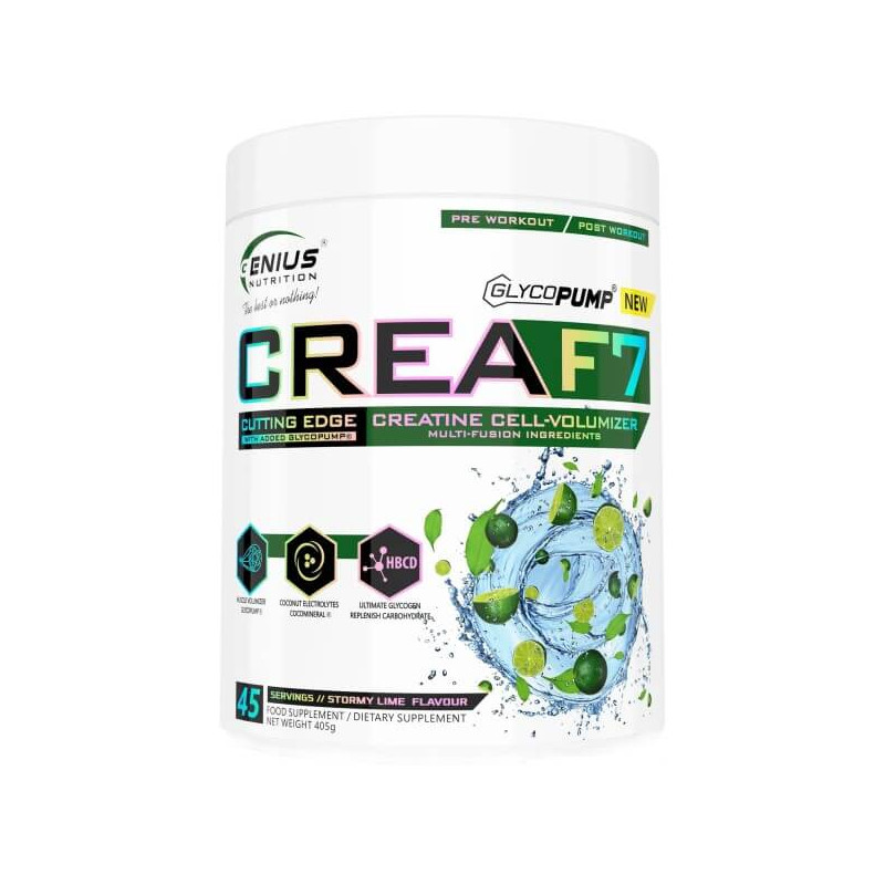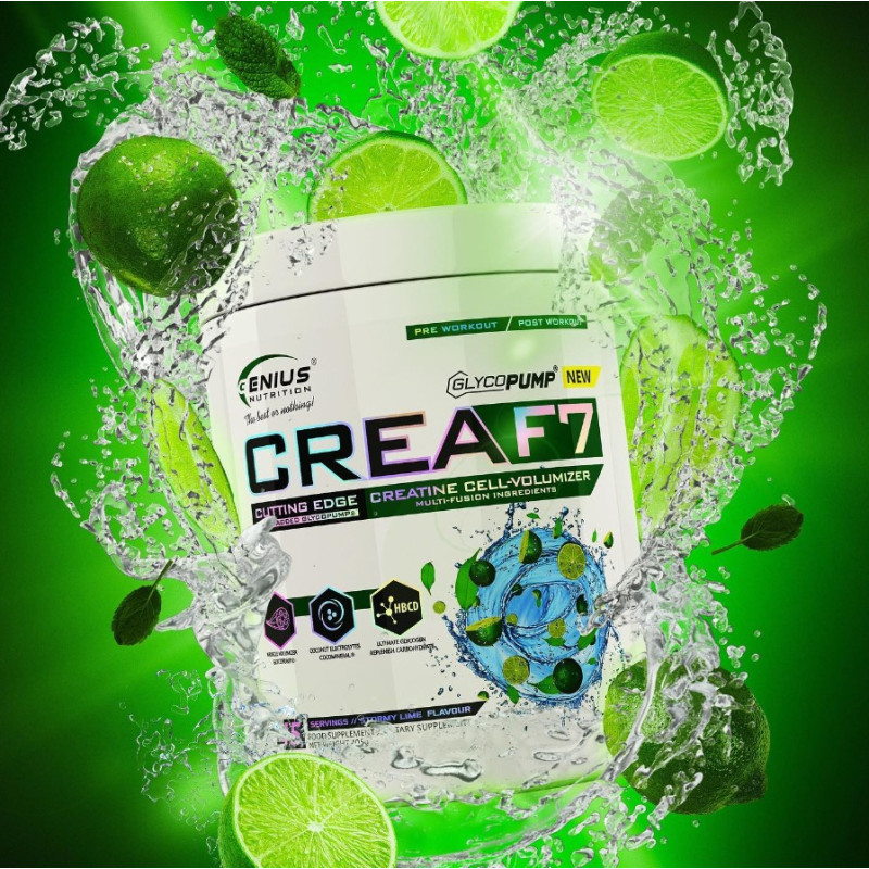 Crea F7 – збалансований комплекс від європейського виробника Genius Nutrition, що містить 6 видів креатину (гідрохлорид, альфакетоглутарат, трикреатин малат, моногідрат, цитрат, піруват), а також декстрин, гліцерин та кокосову воду.