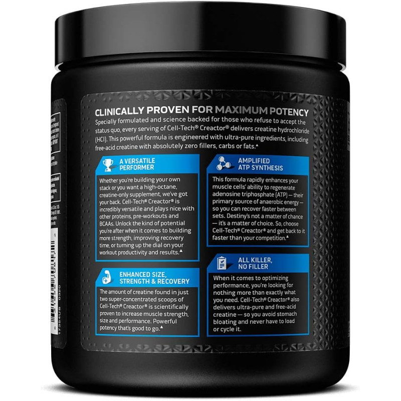Cell-Tech Creactor Creatine HCl від MuscleTech - це інноваційний продукт, розроблений для підвищення спортивної продуктивності та збільшення м'язової маси. Поєднуючи передові технології та високоякісні інгредієнти, цей продукт стає невід'ємним інструментом для тих, хто прагне до ефективного тренування та досягнення результатів.
