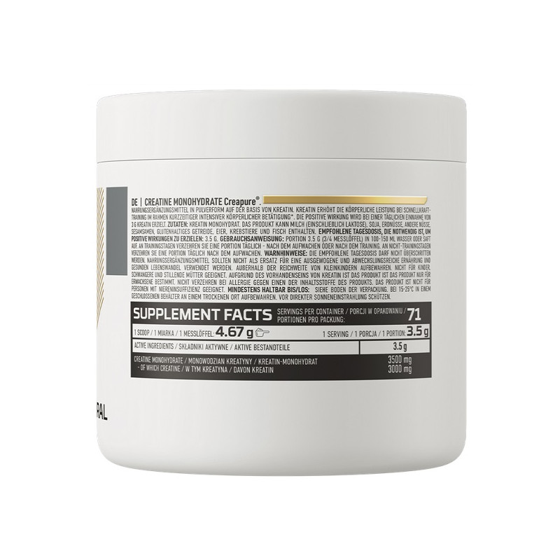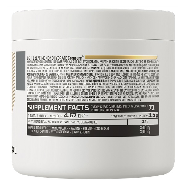 Високоякісний креатин моногідрат, виготовлений з використанням патентованої формули Creapure, відомої своєю чистотою та ефективністю. Цей продукт допомагає підвищити силу, витривалість та сприяє швидкому відновленню м'язів після тренувань. Ідеально підходить для спортсменів і людей, які прагнуть покращити свої результати в спорті або на тренуваннях.