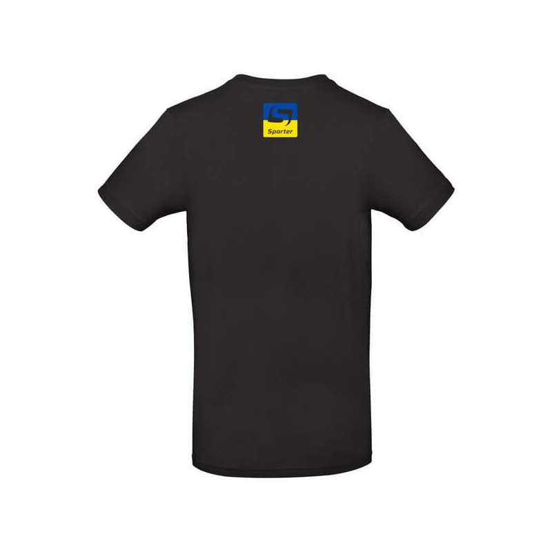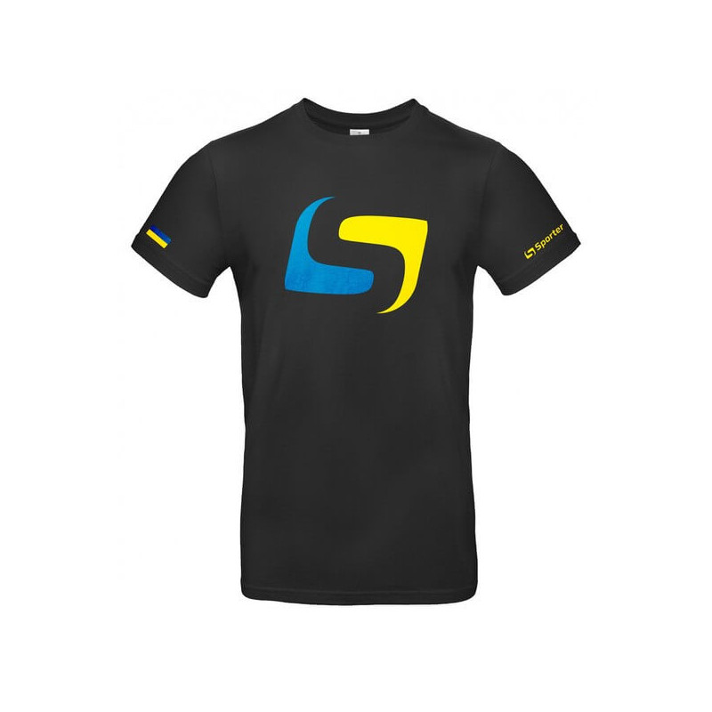 Основний тон футболки – глибокий чорний. На грудях вона принтована великим жовто-блакитним логотипом компанії-виробника. На одному з рукавів можна побачити невеликий прапор України, на іншому – назву бренду. Ззаду, у верхній частині спинки, є зображення прапора з нанесеним по верху чорним лого і словом Sporter.