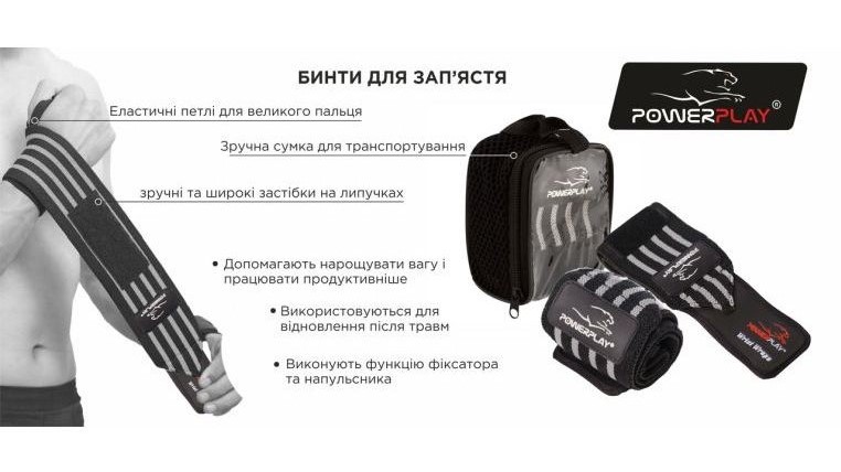 Бинти для запясть PowerPlay-це практичні і зручні спортивні аксесуари, істотно знижують ризик травмування під час виконання силових вправ.