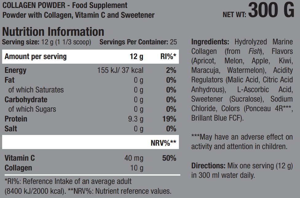 Склад препарату: колаген морський гідролізований (з риби), фруктові ароматизатори, аскорбінова кислота, натрію хлорид , підсолоджувач, регулятори кислотності.
