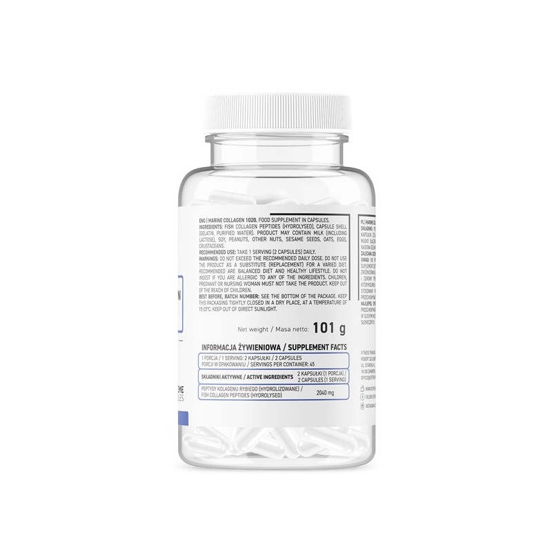 Добавка містить 2040 мг пептидів гидролізованного риб'ячого колагену в кожній порції (2 капсули)