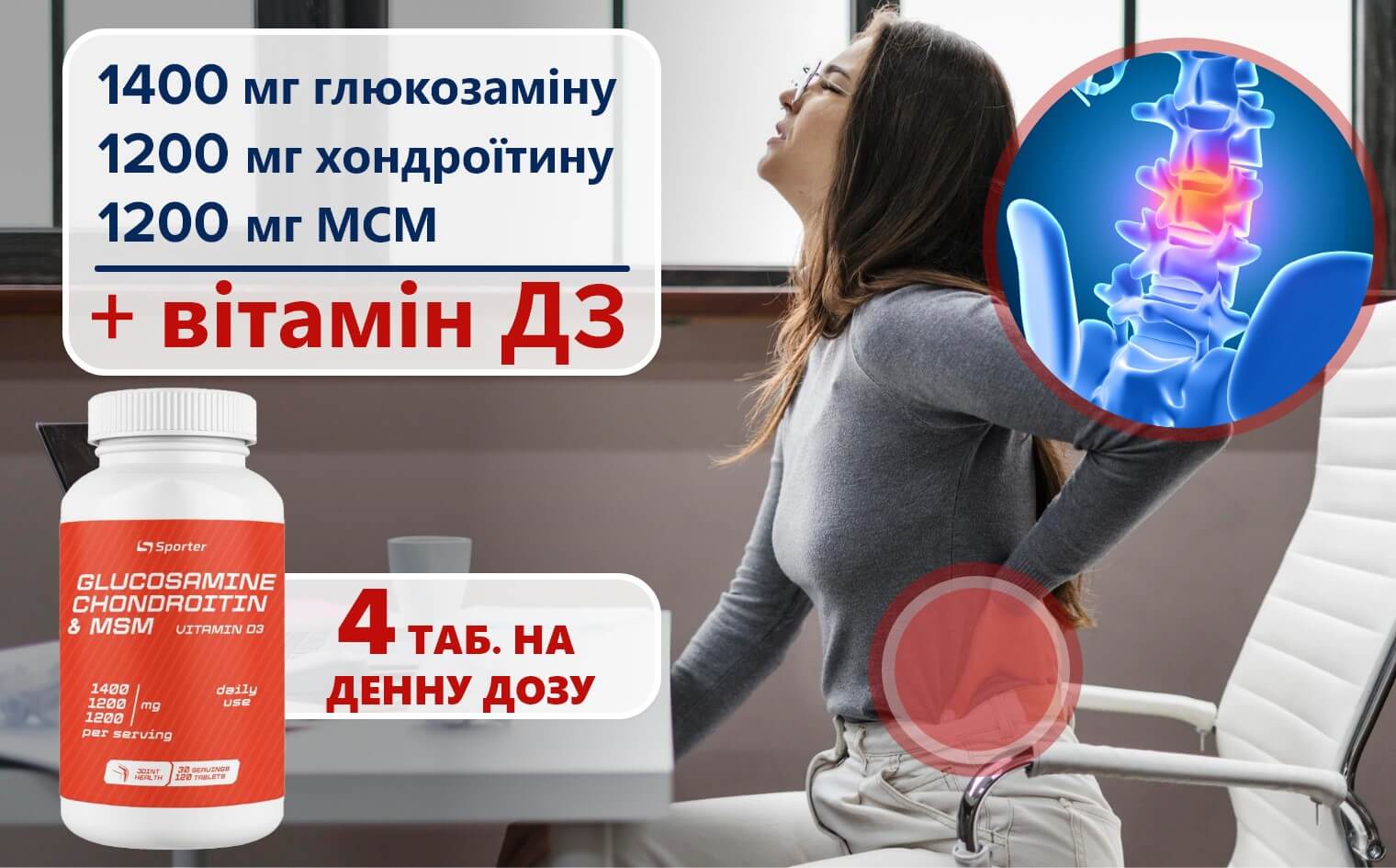 У порції Glucosamine & Chondroitin + MSM + D3 від Sporter з 4 таблеток міститься:
