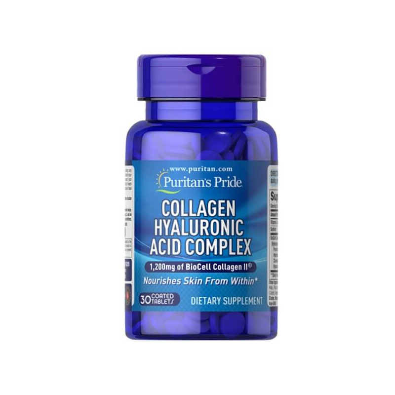 Collagen Hyaluronic Acid Complex від американського бренду Puritan's Pride – збалансована біоактивна добавка, до складу якої входить запатентована формула BioCell Collagen II – гідролізат екстракту курячого хряща з колагеном гідролізатом другого типу, хондроїтином та гіалуроновою кислотою.