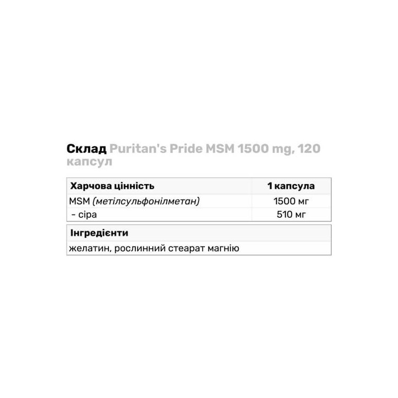 Дієтична біоактивна добавка MSM – насичене джерело органічної сірки від виробника із США Puritan's Pride. Основна діюча речовина представлена у складі продукту у вигляді метилсульфонілметану.