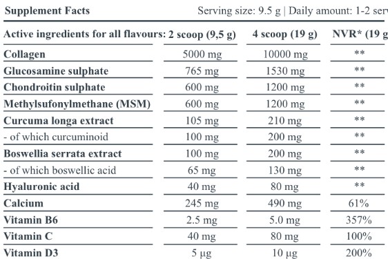 | Інші інгредієнти: гідролізований яловичий колаген 53%, сульфат глюкозаміну KCl (з молюсків) 11%, кальцієві солі ортофосфорної кислоти, хондроїтинсульфат 7%, ЧСЧ 6,3% [метилсульфонілметан, аромат проти стеження (діоксидмонія) кислота) , полідекстроза, екстракт кореневища куркуми довгою, екстракт камеді та смоли індійського ладану (Boswellia serrata), сіль, гіалуронова кислота, підсолоджувач (сукралоза), ласкорбінова кислота. гідрохлорид пірідоксину, холекальциферол, крас. | |