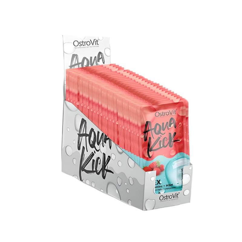 OstroVit Aqua Kick Flex - це біологічно активна добавка, яка є джерелом метилсульфонілметану, відомого також як органічна сірка, і глюкозаміну сульфату, який є найбільш біодоступною формою цієї сполуки. Це продукт із приємним полуничним смаком, що випускається в зручній формі порошку, який слід змішати з водою. Цей продукт забезпечує адекватне надходження рідини в організм, доповнюючи щоденний раціон цінними інгредієнтами.