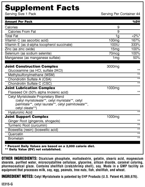 а також хондроїтин сульфат типу а і В, желатин, глюкозамін, лляне масло, комплекс цетил мірістолеат, гіалуронову кислоту, куркуму, корі нь імбиру, бромелайн, кварцетин, білки сироваткового типу, масло з сої, стеаринову кислоту, гліцерин і очищену воду.