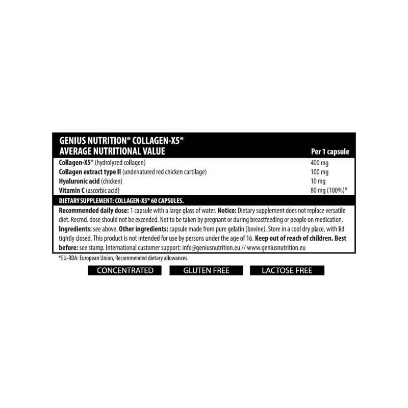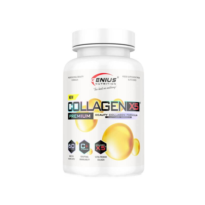 Collagen-X5 від популярного шведського виробника Genius Nutrition – універсальна біодобавка, що складається з гідролізованого колагену, натурального колагену другого типу, гіалуронової кислоти та вітаміну С. Вона має широкий спектр дії та підходить як чоловікам, так і жінкам.