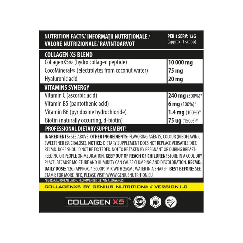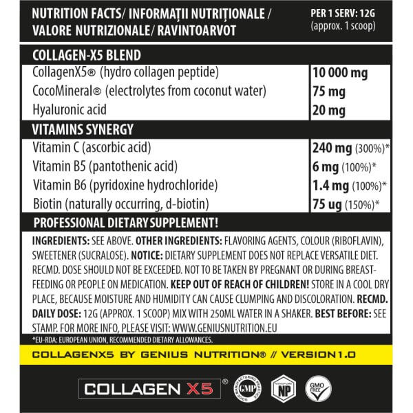 У порції порошку Collagen-X5 powder від Genius Nutrition масою 12 г міститься:
