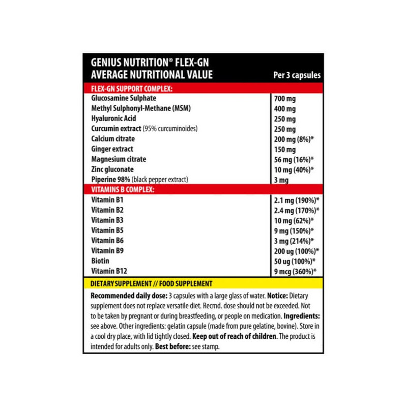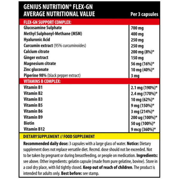 Flex-GN від популярної європейської компанії Genius Nutrition – потужна комплексна біодобавка для суглобів, хрящів та зв'язок у зручній капсульній формі. До її складу входять глюкозамін, ЧСЧ, гіалуронова кислота, а також вітаміни, мінерали та рослинні екстракти. Кожен компонент отриманий з натуральної сертифікованої сировини та введений до складу ретельно підібраної дозування.
