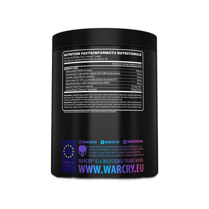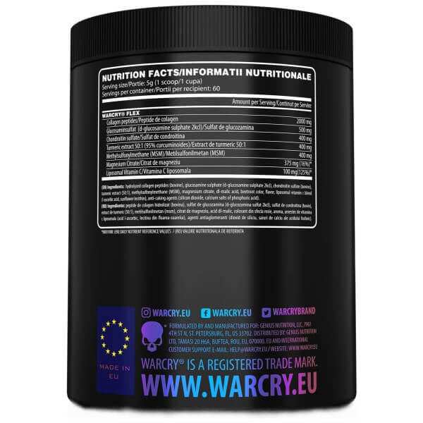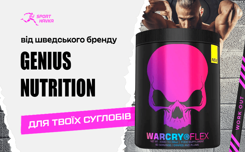 Warcry Flex – збалансована біодобавка від шведського бренду Genius Nutrition, до складу якої входять хондроїтин, глюкозамін, пептиди колагену, органічна сірка, вітаміни, мінерали та рослинні екстракти. Оптимальна добірка активних компонентів забезпечує продукту широкий спектр позитивного на організм.