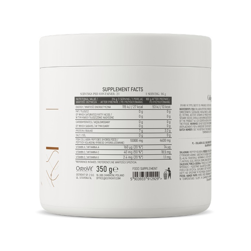 OstroVit Collagen Kissel це дієтична добавка без додавання цукру, яка забезпечує організм цінними вітамінами, такими як вітамін А, вітамін С та вітамін Е. Це колаген, який відрізняється унікальним смаком солодкої полуниці та випускається у формі киселю, який дуже легко приготувати. OstroVit Collagen Kissel – джерело гідролізованих пептидів риб'ячого колагену, структура якого нагадує людський колаген, завдяки чому препарат чудово засвоюється організмом людини.