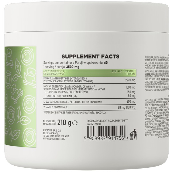 OstroVit Collagen + Matcha високоякісна біологічно активна добавка, яка є джерелом чотирьох цінних компонентів - до складу продукту входять гідролізовані пептиди риб'ячого колагену, а також порошок листя зеленого чаю матчу, відновлений L-глютатіон та вітамін С. Це продукт із простим складом, що випускається у порошкоподібній формі, призначений для людей, які бажають доповнити свій щоденний раціон цінними сполуками.