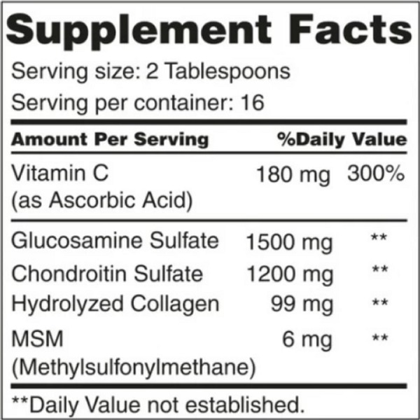 Рідка добавка, яка поєднує глюкозамін, хондроїтин і вітамін C для підтримки здоров'я суглобів і хрящів. Глюкозамін і хондроїтин є ключовими компонентами для відновлення хрящової тканини та підтримки її структури. Вітамін C допомагає в процесах колагеногенезу, сприяючи здоров'ю сполучних тканин, і підвищує ефективність засвоєння глюкозаміну та хондроїтину. Продукт покращує гнучкість суглобів, зменшує запалення і біль, що виникають під час фізичних навантажень.