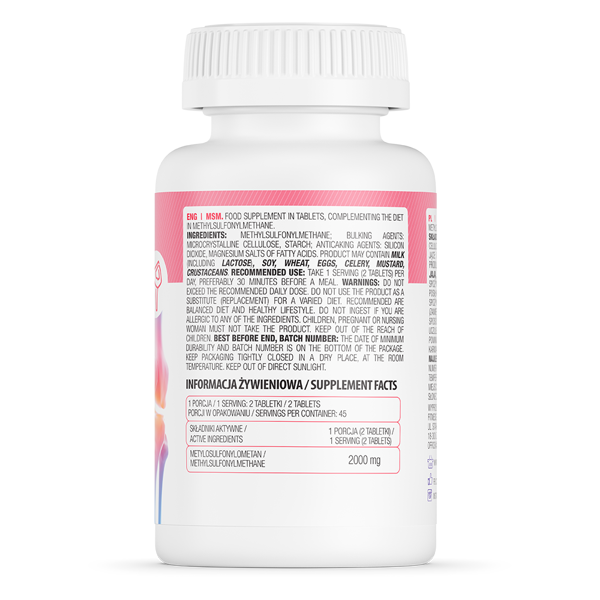 Кожна порція добавки (2 таблетки) містить 2000 мг МСМ. Регулярний прийом препарату дозволяє: