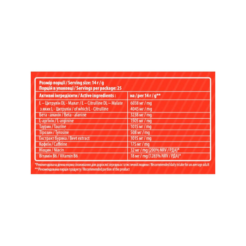 Ulta Max Pre-Workout – біоактивна добавка від популярного вітчизняного бренду Sporter, оптимально збалансований передтренувальний стимулятор, до складу якого входять амінокислоти, вітаміни, кофеїн та екстракт буряків. Усі компоненти одержані з натуральної сировини, обробленої із застосуванням прогресивних технологій.