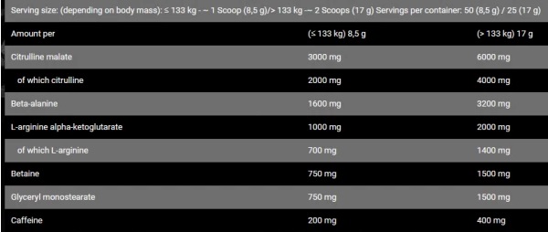 Залежно від маси тіла змішайте 1 мірну ложку порошку (8,5 г для <130 кг) зі 150-200 мл води або 2 мірні ложки порошку (17 г для >130 кг) з 300-350 мл води та вживайте за 30 хвилин до тренування.