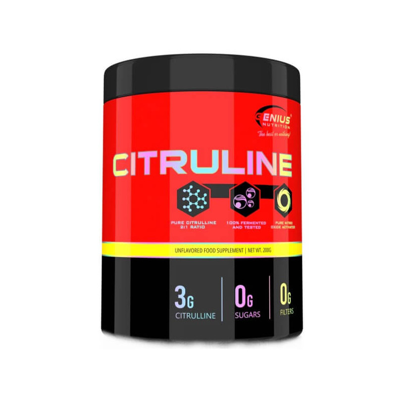 Citruline – дієтична біодобавка від шведського бренду Genius Nutrition, що є активним цитруліном у легкозасвоюваній формі малата. Цитрулін є замінною амінокислотою, що виробляється людським організмом, але, найчастіше, у кількості, недостатній для його продуктивної життєдіяльності. Особливо це актуально щодо чоловіків і жінок, які регулярно піддаються інтенсивним фізичним навантаженням. Для них дуже важливий достатній рівень аргініну, попередником якого якраз і є цитрулін. Якісна добавка стане чудовим способом підтримати запаси цих амінокислот.