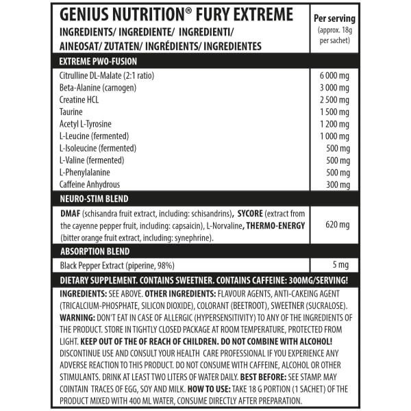 У порції сухого порошку Fury Extreme Genius Nutrition масою 18 г міститься: