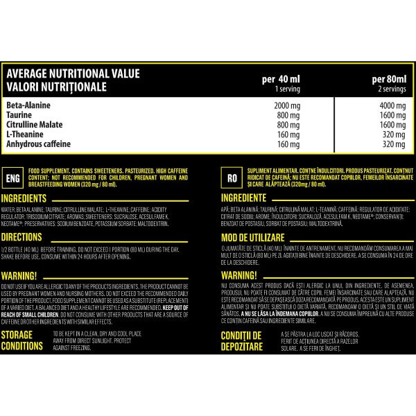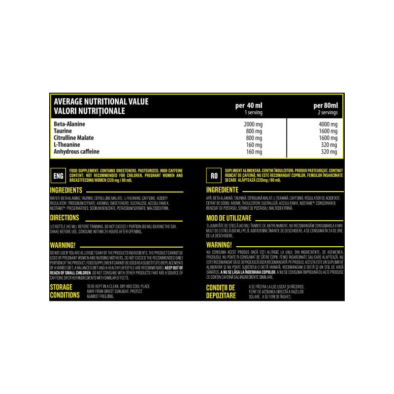 У порції передтренувального комплексу Fury Extreme Shot від Genius Nutrition об'ємом 40 мл (половина шота) міститься: