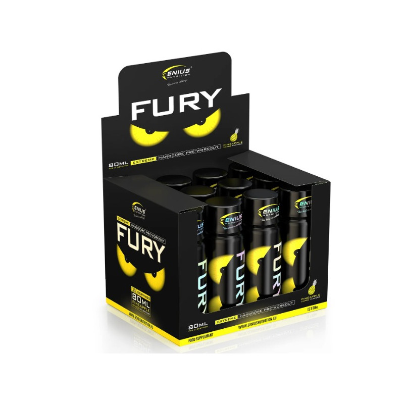 Fury Extreme Shot - рідкий передтренувальний комплекс від шведського виробника Genius Nutrition з приємним насиченим смаком, що не залишає після себе штучного смаку, і оптимально підібраним складом. Напій містить незамінні та замінні амінокислоти, а також натуральний зневоднений кофеїн. Всі інгредієнти приведені в біодоступний формат і легко засвоюються.