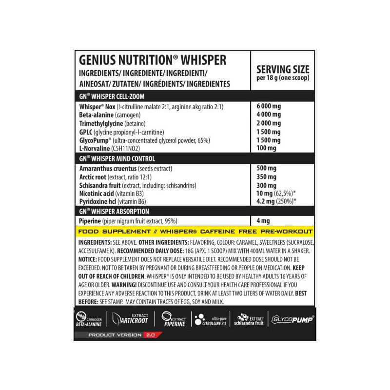 Whisper – мультикомпонентний передтренувальний комплекс від шведського виробника Genius Nutrition, у складі якого присутні амінокислоти, рослинні екстракти та вітаміни.