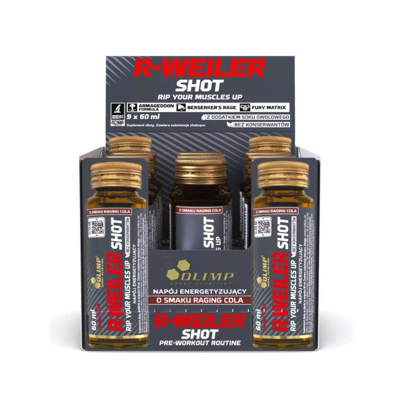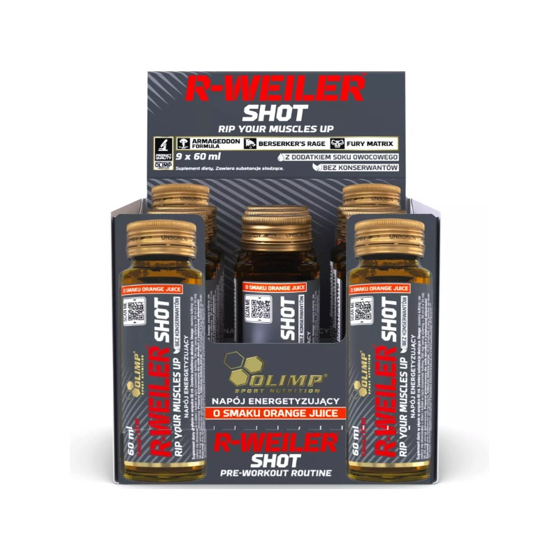 R-WEILER Shot від Olimp - це потужний енергетичний продукт, створений для тих, хто прагне максимально підвищити свою продуктивність і зосередженість під час тренувань. Цей інноваційний комплекс поєднує в собі ретельно підібрані інгредієнти, які підтримують витривалість, покращують концентрацію та сприяють загальній фізичній активності. Кожна упаковка містить 9 шотів по 60 мл, кожен з яких готовий до вживання в будь-який момент.