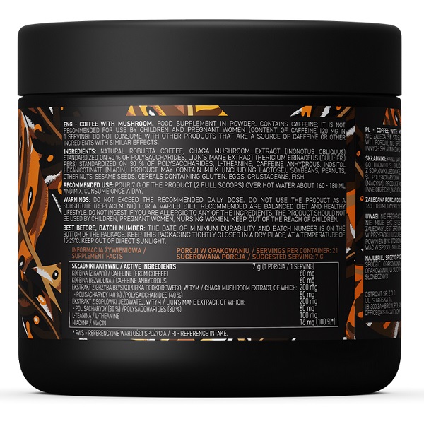 Coffee with Mushroom OstroVit — це поєднання якісної кави з грибними екстрактами, що забезпечує природний заряд енергії та підвищує концентрацію. Цей напій підтримує імунну систему та сприяє загальному зміцненню організму.