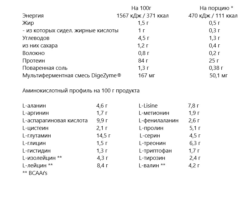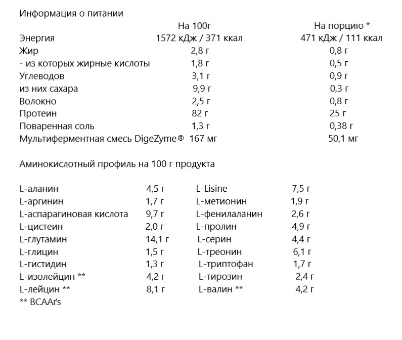 Смак шоколад: 90% (ISOLAC ®) ізолят сироваткового протеїну (емульгатор: соєвий лецитин), 6% какао-порошок (Theobroma cacao L.), загусники: гуарова камедь, ксантанова камедь ; Ароматизатор, хлорид натрію, емульгатор: соєвий лецитин; Підсолоджувачі: ацесульфам К, сукралоза, стевіолглікозіди; Суміш каламуті-ензимів: амілаза, протеаза, целлюлаза, ліпаза і лактаза (DigeZyme®).