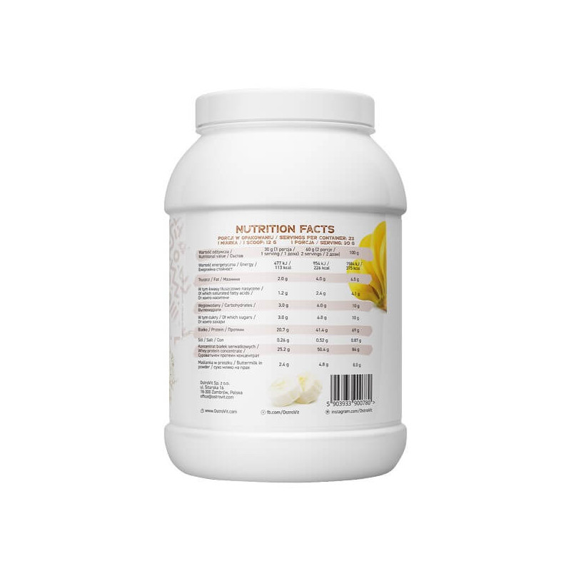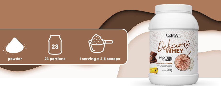 А ще – для тих, хто вважає за краще поєднувати користь із задоволенням – адже даний продукт пропонується у формі однорідного, добре розчинного порошку, з якого можна готувати чудові коктейлі. Їхній смак ви вибираєте самі. У нашому магазині можна придбати WHEYlicious від Ostrovit зі смаками банана з шоколадом, персика зі вершками або полуничних вафель.