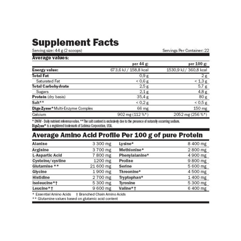 У порції Micellar Casein від Amix масою 44 г сухого порошку міститься: