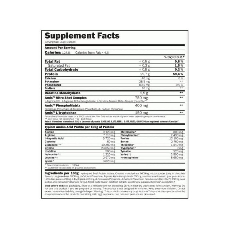 У даній біоактивній добавкі протеїн представлений у формі ізоляту, посилений креатином, триптофаном, мінеральною матрицею, а також амінокислотним комплексом Nitro Shot, що відповідає за високу швидкість постачання тканин мікроелементів.