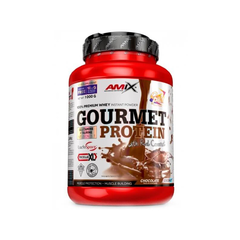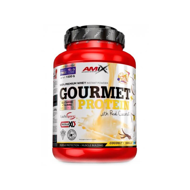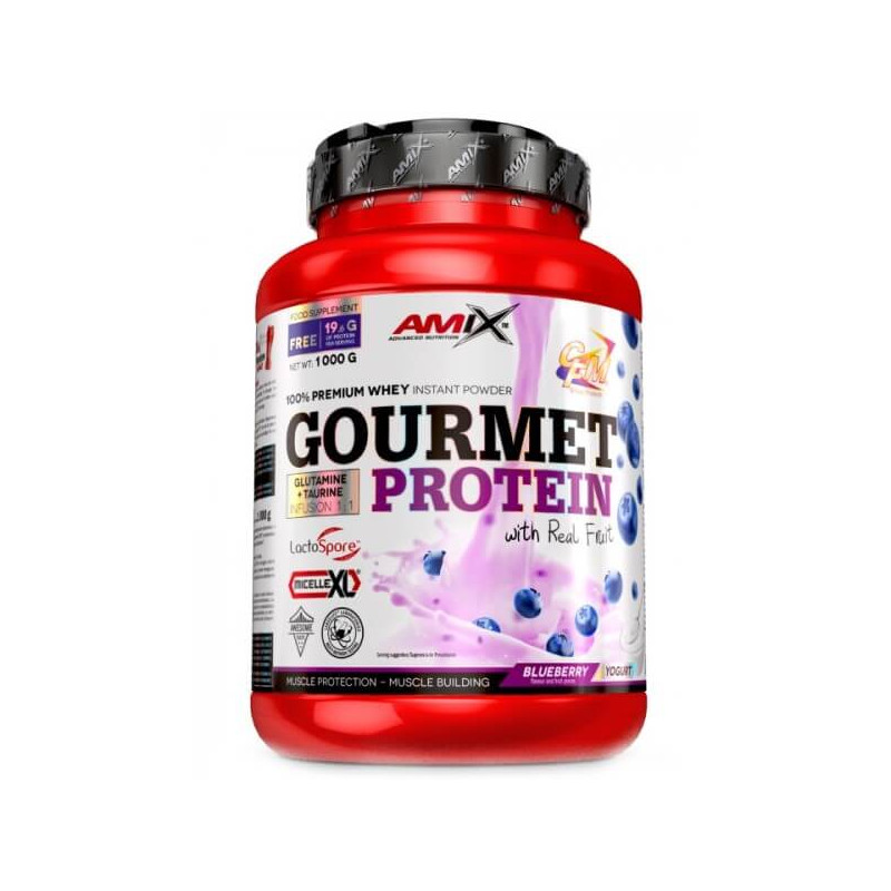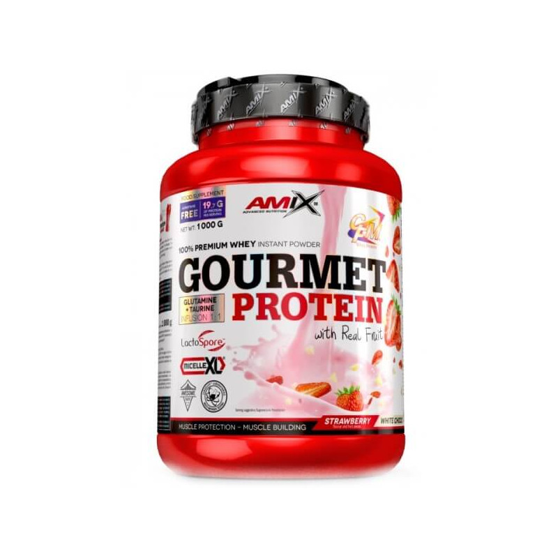 Gourmet Protein від британського бренлу Amix – білкова харчова добавка у порошку для справжніх гурманів. До її складу входять кілька різновидів протеїну: сироватковий ізолят CFM – унікальний компонент, отриманий методом мікрофільтрації, ультрафільтрований сироватковий концентрат, молочний міцелярний казеїн. Також у суміші присутні сироватковий альбумін, лактобектерії, імуноглобулін, амінокислоти та інші складові. А ще – шматочки натуральних фруктів.
