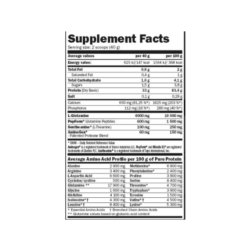 У порції казеїнового продукту Micelle HD Casein від Amix масою 40 г міститься:
