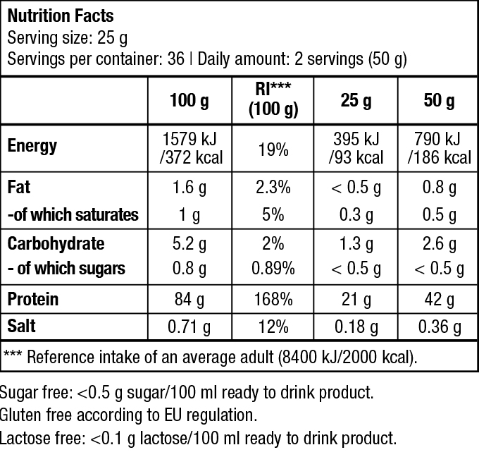 Інгрідієнти: ізолят сироваткогового білка 87% (емульгатор: лецитини (соя)), кремоподібна суміш (частково гідрований кококсовий жир, сухе знежирене молоко), емульгатори (Е471, Е472а), глюкозний сироп, сахароза, молочний білок, стабілізатор (фосфати калію), антизлежувач (фосфати кальцію), ароматизатори, л-глютамін, емульгатор: лецитини (соя), згущувач (карагенан, ксантанова камедь), харчова сіль, антизлежувач (діоксид кремнію), л-лейцин, підсолоджувач (сукралоза), л-ізолейцин, л-валін.