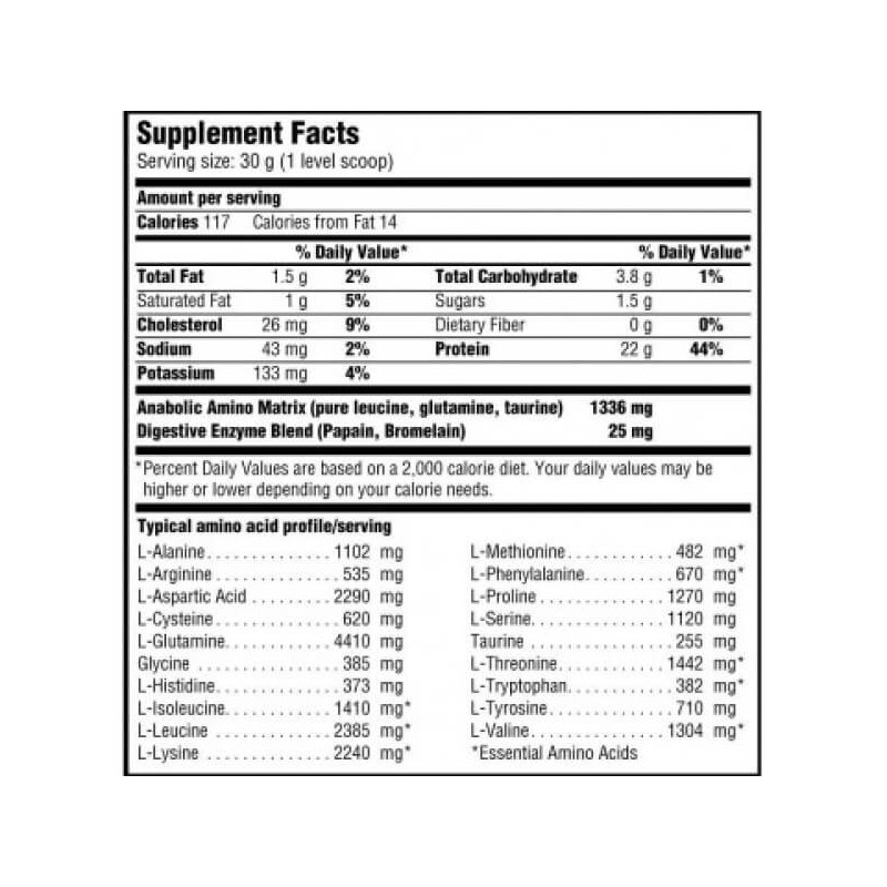 Добавка містить 47,5% амінокислот, що відносяться до класу анаболічних-ВСАА, тирозин, аргінін, глютамін, а також 10% чистих білкових іммуноглобулінових фракцій, які сприяють зміцненню імунітету. До складу препарату також входять квадропептіди, які перешкоджають розвитку запальних процесів і прискорюють відновлення після інтенсивних тренувань.