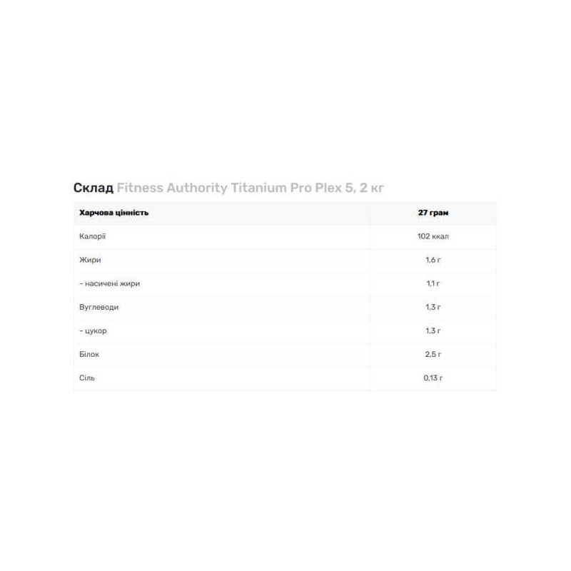 У порції порошку Titanium Pro Plex 5 Fitness Authority масою 27 г міститься: